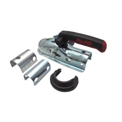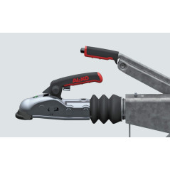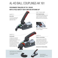 Il giunto a sfera AL-KO in acciaio, è dotato di una leva di sicurezza per accoppiamenti: quando, dopo essere stato agganciato, si evidenzia il cilindro verde, significa che il giunto è stato agganciato correttamente. Presa Soft-touch nella zona rossa della maniglia è applicato un materiale sintetico morbido che consente una presa sicura. Inoltre, la sporgenza all'estremità della maniglia evita lo scivolamento. OMOLOGATO CE.